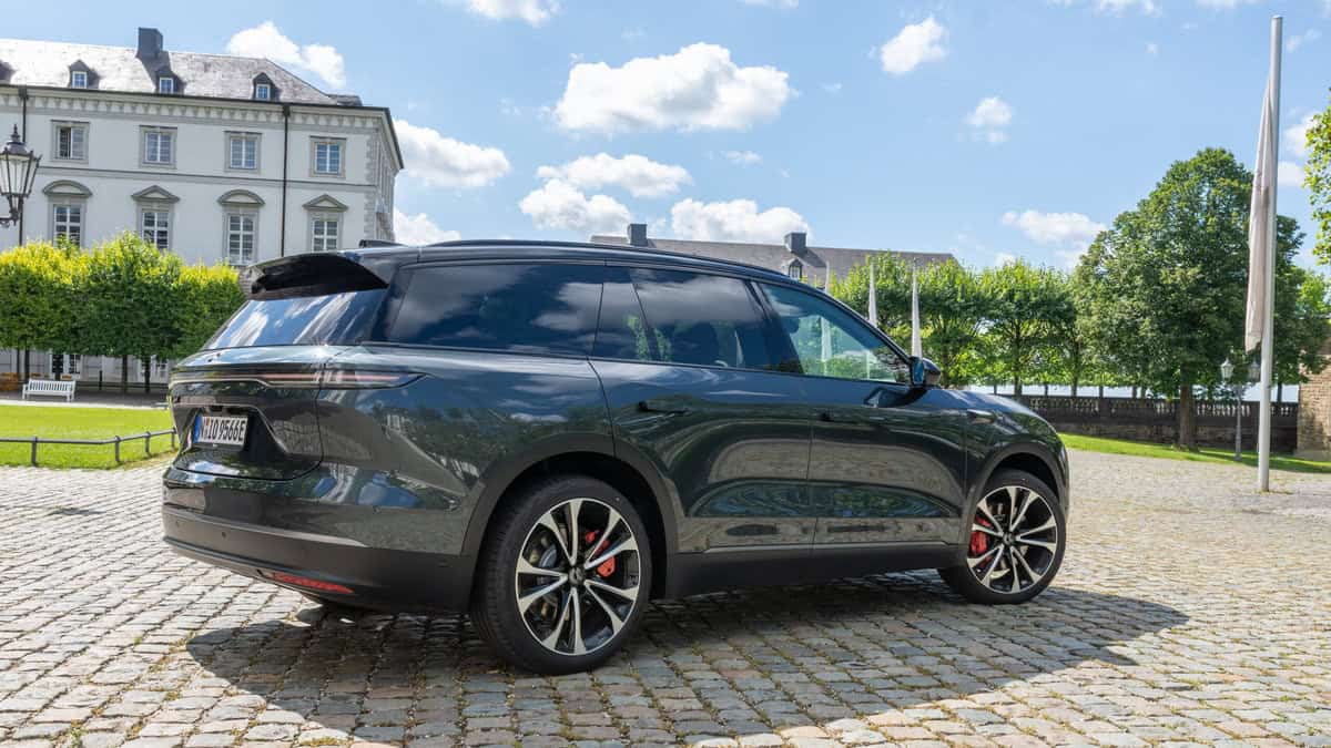 Trotz 5,10 Metern Länge wirkt der EL8 dank geschwungener Formen nicht übertrieben wuchtig. Unser Testwagen trägt die Farbe “Nebula Green” (2000€) sowie 21″ Felgen (1500€). Wer 21″ oder 22″-Felgen wählt erhält zudem immer orange lackierte Bremssättel.