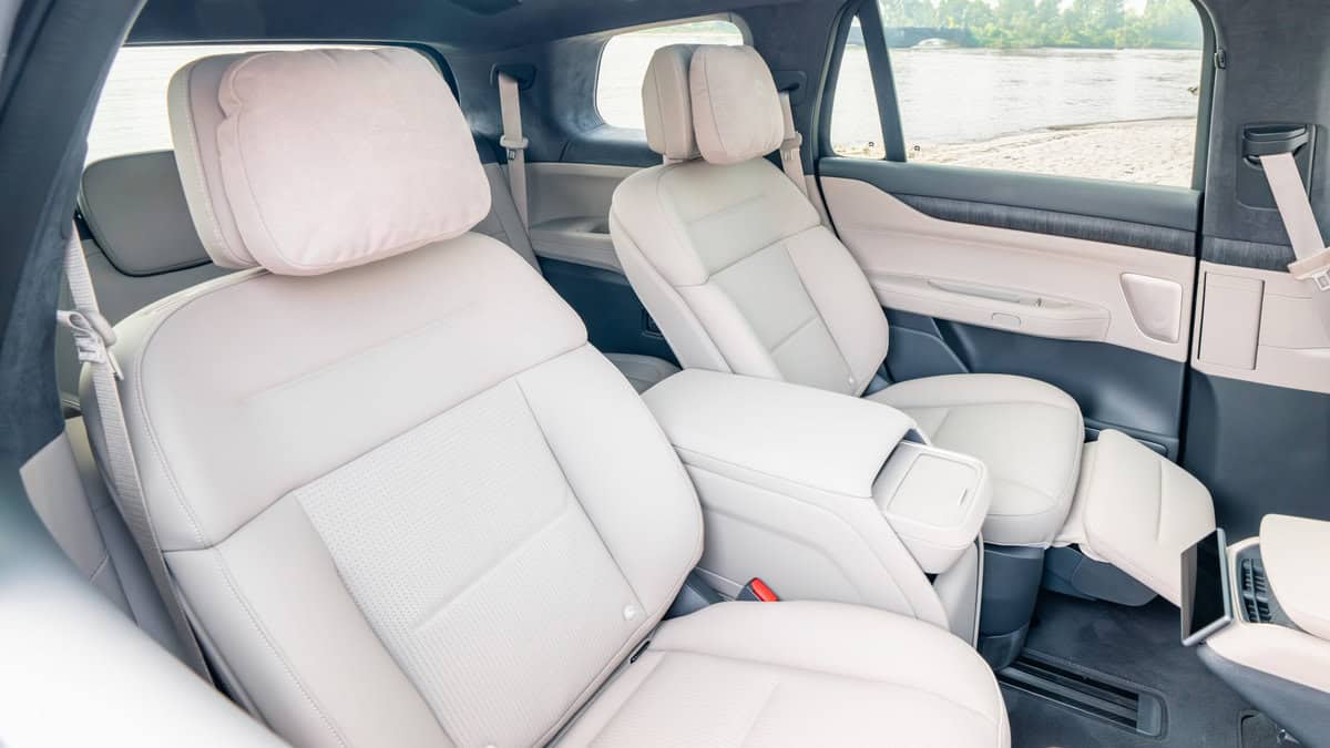 Gediegen auch die Plätze in der zweiten Reihe, inklusive Sitzheizung, -lüftung und -massage. In der Mittelkonsole, welche der ‘Executive’-Version vorbehalten ist, können Smartphones induktiv geladen und Lebensmittel gekühlt oder erwärmt werden. Quelle: NIO