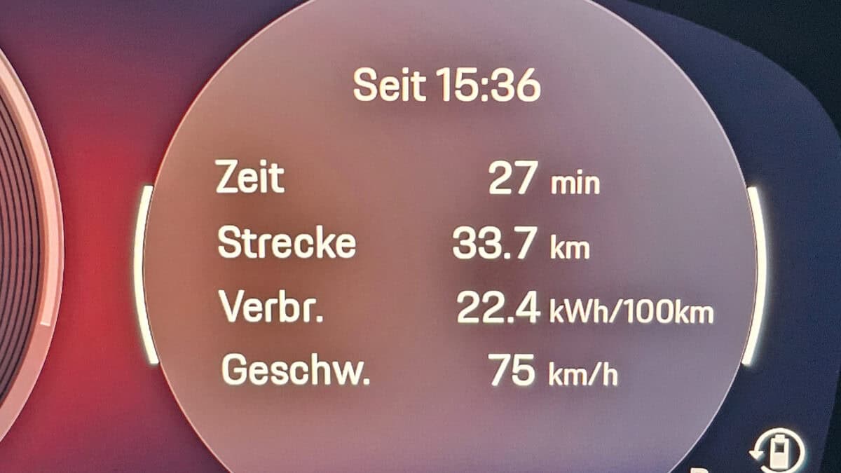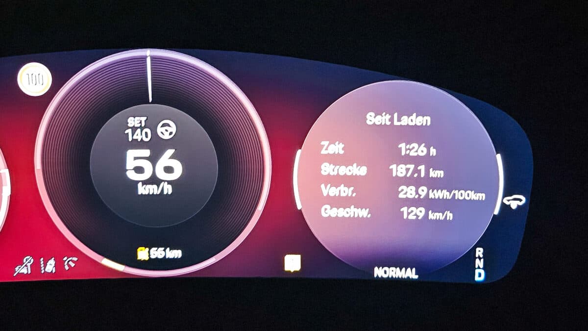 Wir starten außerdem denkbar schlecht vorbereitet: Da wir nicht zuhause laden können, beginnen wir unseren Test mit knapp 40% Akkustand und vollständig ausgekühltem Innenraum und Akku, was den Verbrauch auf den ersten Kilometern ebenfalls deutlich erhöhen wird.